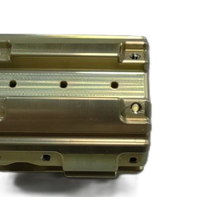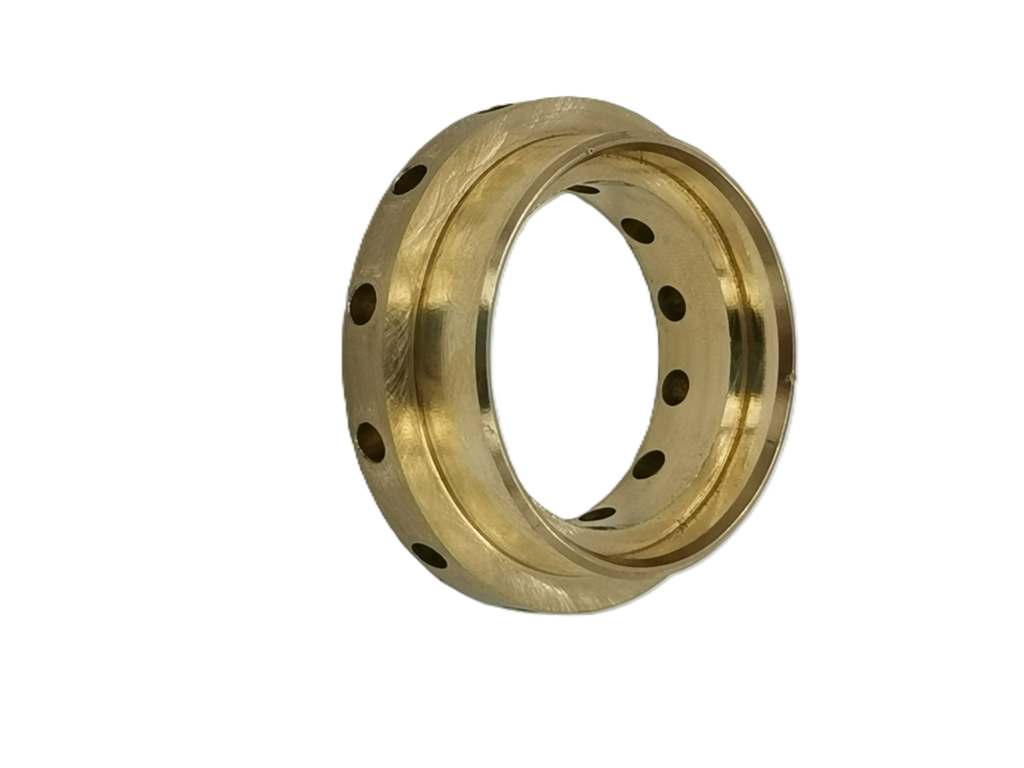 The gold-colored hollow cylinder in the image showcases through-holes and grooves created via CNC turning + milling.