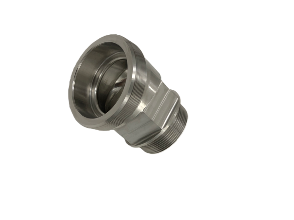 Internal bores and threads (visible in the black flanged components)